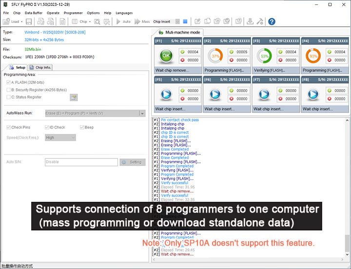 Put the chips into programmer in order, the programmers detects the chips and starts programming automatically. Each programmer works independently and in asynchronous mode, no need to wait for synchronization, with high efficiency.The software interface is as follows.