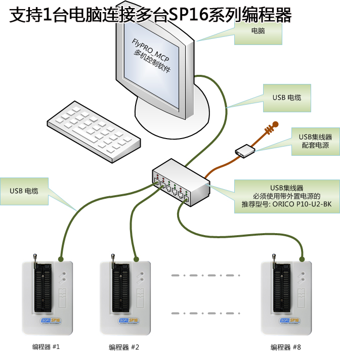 ? 提供多機操作軟件FlyPRO MCP(此軟件已經集成在FlyPRO軟件安裝程序中) ? 單臺電腦可以最多連接8臺SP16系列編程器 ? 可以支持8臺燒錄器同時工作, 包括:自動燒錄(單次)、量產燒錄、下載脫機數據(SP16-F/SP16-FX) ? 支持項目文件的管理方式
