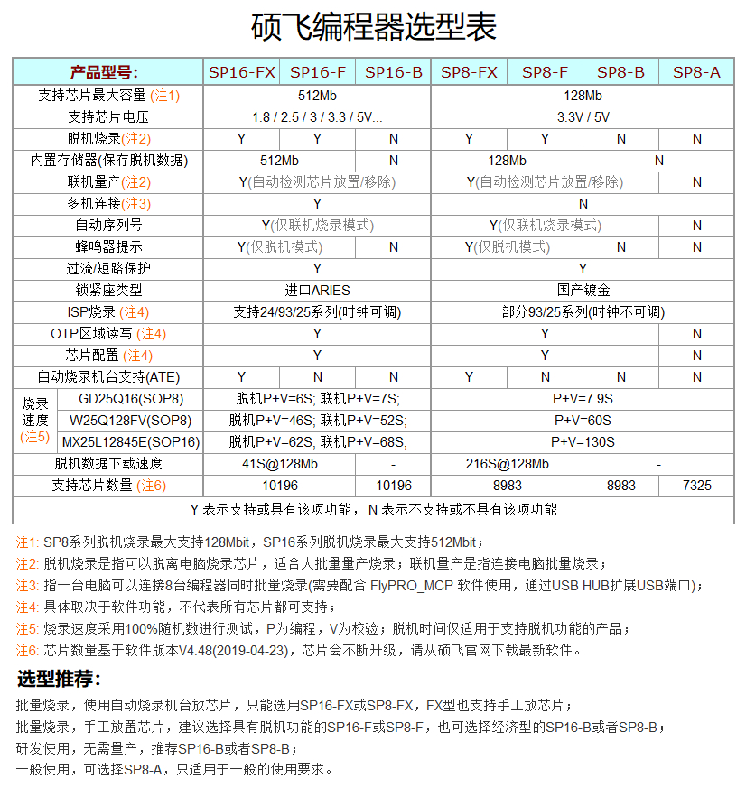 性能特點 ● USB2.0通訊接口(真正的USB接口,非USB轉串口或模擬USB口) ● 開模定制精致外殼(非市場上公模外殼可比),體積小巧(尺寸:103x71x23mm),使用攜帶方便 ● 全面支持WinXP/Vista/Win7/Win8/Win10,完美兼容32/64位系統 ● 內置32位高速處理器,專門針對串行存儲器進行設計,實現極速精準燒錄 ● 支持幾乎所有的93/24/25/BR90系列存儲器,支持軟件升級增加對新芯片的支持 ● 獨有ISP下載接口,提供10PIN彩色ISP下載線,對于板載的貼片芯片(比如引出了SPI接口的電腦主板BIOS)可以直接連線燒寫, ● 標準40腳零插入力鎖緊座,寬窄芯片和通用適配器都可以使用 ● 支持引腳接觸不良檢測,有效提高燒錄可靠性 ● 完善的過流和ESD保護,有效保護編程器和電腦USB口不致因意外損壞 ● 量產燒錄模式,自動檢測芯片放置并啟動編程操作 ● 可選脫機燒錄功能:內置128Mbit數據存儲器,無需連接電腦就可實現各種現場編程,LED和蜂鳴器聲音提示成功或失敗, 操作簡單,輕松實現芯片大批量燒寫 ● 可根據量產需要靈活配置脫機版編程器數量,由于各編程器各自獨立,即插即寫,沒有同步等待時間,極速高效 ● 支持低壓(3.3V)和5V芯片 ● 提供設備自檢功能 注:上述功能依產品型號而定,只有SP8-F具有全部的功能,具體參考附后的型號對照表。