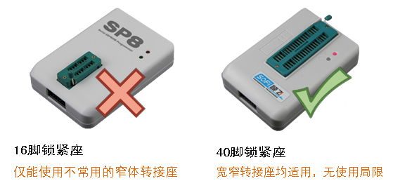 40PIN通用鎖緊座 ● 采用寬窄兩用型40PIN鍍金鎖緊座 ● 可以直接用于8腳到16腳的任意直插芯片 ● 可以直接使用任何通用適配器,無論是引腳寬度是300mil還是600mil ● 可直接使用最多40個引腳的適配器 SP8在設計之初使用16腳的鎖緊座(下圖左),測試中發現這種鎖緊座只能支持300mil的芯片和適配器,而市場上的適配器基本上都是600mil寬度,無法插入16腳的鎖緊座,使用受到嚴重的局限。基于這些原因,碩飛科技果斷重新修改模具,采用了通用性更強的40腳款窄適用的鎖緊座。